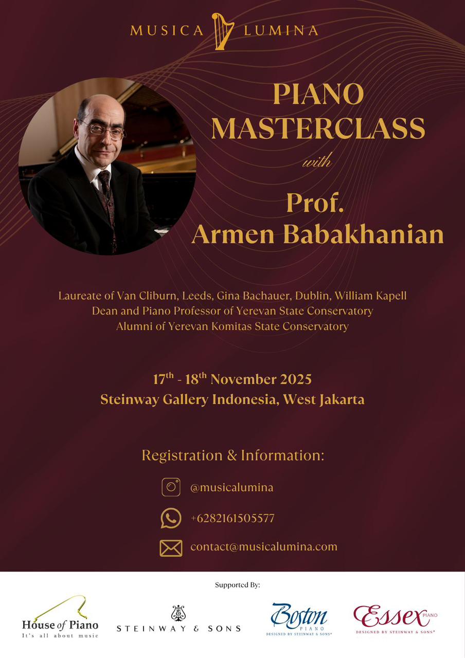Two days masterclass with Prof. Armen Babakhanian, brought by Musica Lumina and held at Steinway Gallery Jakarta, where he worked closely with young pianists, guiding them through technique, expression, and artistry at Steinway Gallery Jakarta.